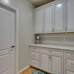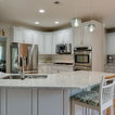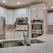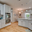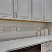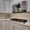 Designed by Susan Rotelli of Reico Kitchen & Bath's Fredericksburg, VA showroom, this transitional kitchen design features cabinets from Merillat Masterpiece in the Alina door style in Maple with a Dove White with Cinder Glaze finish. Countertops are Cambria engineered stone in the color Montgomery. This peninsula kitchen also features a small butlers pantry area to the side of the double oven and cabinet.