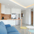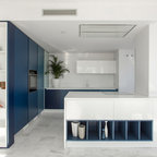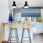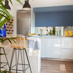 Cette photo montre une cuisine linéaire tendance avec un évier encastré, un placard à porte plane, des portes de placard blanches, un plan de travail en bois, une crédence bleue, une crédence en carreau de miroir, un électroménager en acier inoxydable, un sol en bois brun, une péninsule et un sol marron. — Houzz