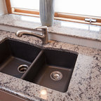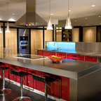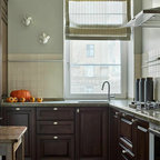 Cette photo montre une cuisine ouverte parallèle chic de taille moyenne avec un évier encastré, un placard avec porte à panneau encastré, des portes de placard noires, un plan de travail en quartz modifié, une crédence beige, une crédence en carrelage de pierre, un électroménager en acier inoxydable, un sol en bois foncé et un îlot central. — Houzz