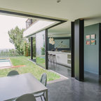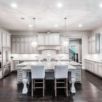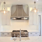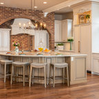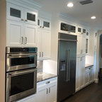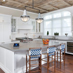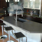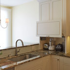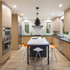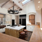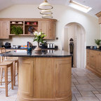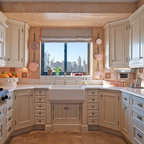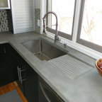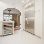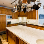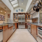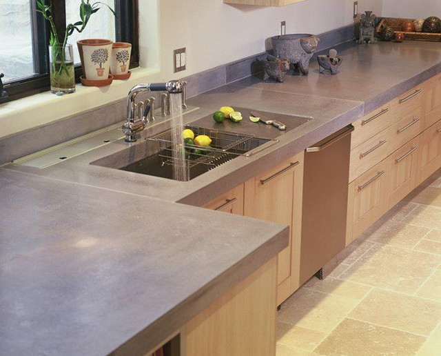 Inspiration pour une cuisine américaine traditionnelle de taille moyenne avec un évier encastré, un placard à porte shaker, des portes de placard en bois clair, un plan de travail en béton, un électroménager en acier inoxydable et un sol en travertin. — Houzz