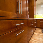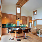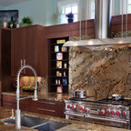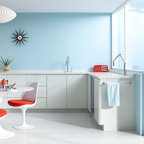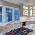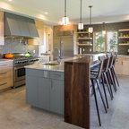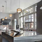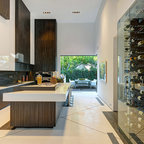 Exemple d'une cuisine tendance fermée avec un plan de travail en marbre, un électroménager en acier inoxydable et un îlot central. — Houzz