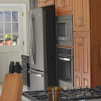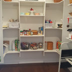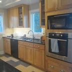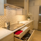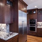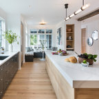 Idées déco pour une grande arrière-cuisine parallèle classique avec un évier de ferme, un placard à porte affleurante, des portes de placard blanches, un plan de travail en quartz, une crédence multicolore, une crédence en mosaïque, un électroménager encastrable, un sol en bois brun, un îlot central, un sol marron et un plan de travail gris. — Houzz